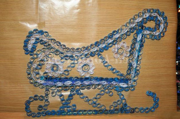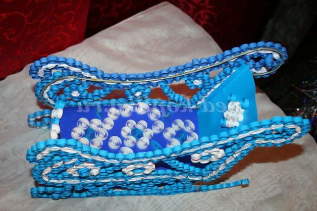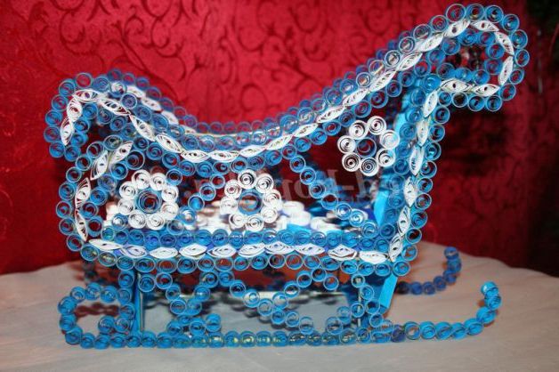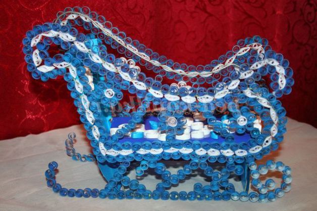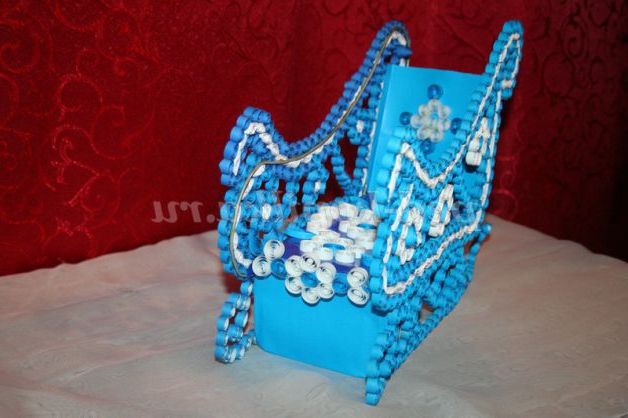 Центр санок прикрасити квіточками з білих і блакитних ролів. Вийде бічна частина карети. Їх знадобиться виготовити 2 штуки.