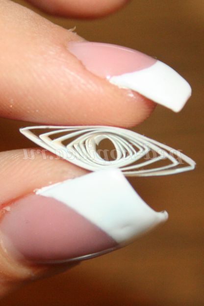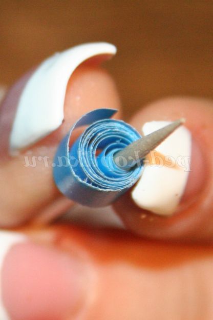 За допомогою зубочистки скрутити смужки у вигляді ролу. Акуратно зняти готовий рол з зубочистки і трохи його розпустити. Кінчик спіралі приклеїти.