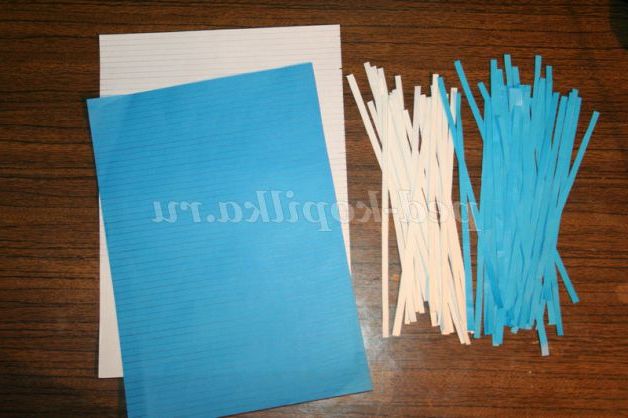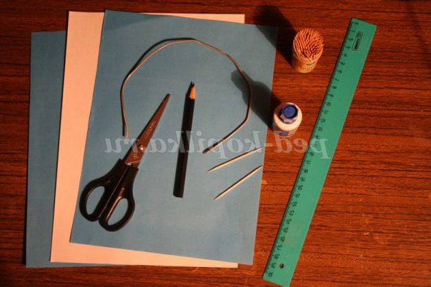 Матеріал: двосторонній кольоровий папір білого, блакитного і синього кольору формату А4, зубочистки для скручування паперу, клей-олівець, ножиці, лінійка, простий олівець, тонка алюмінієва дріт.