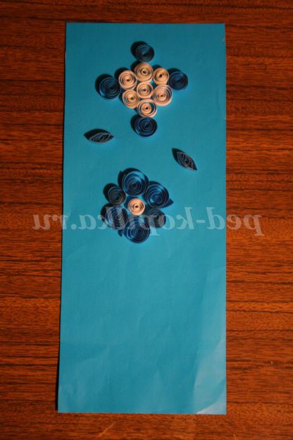 Для додання кареті обсягу необхідно виготовити задню спинку і дно. Для цього виріжте смужку самоклеющейся паперу блакитного кольору шириною 12 див. Прикрасити її квітами і пелюстками в стилі квілінг.