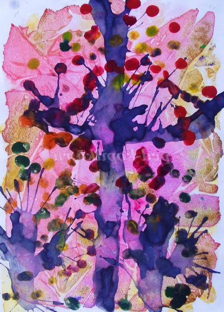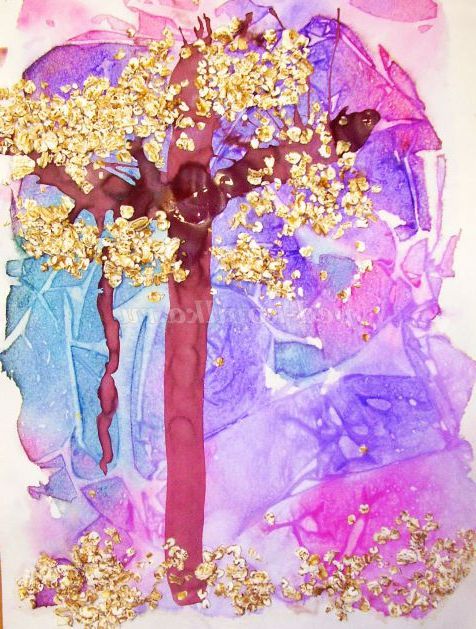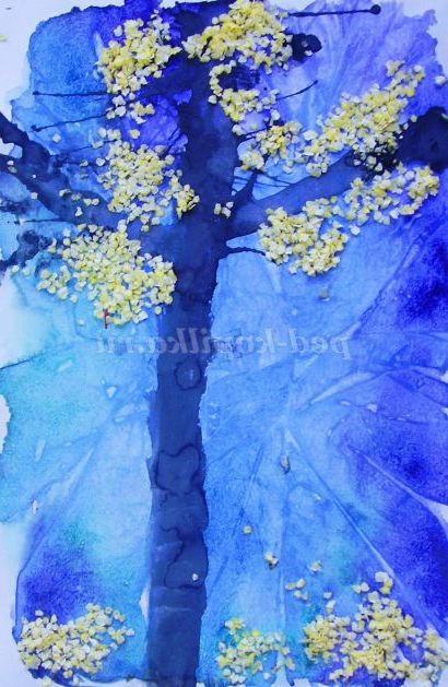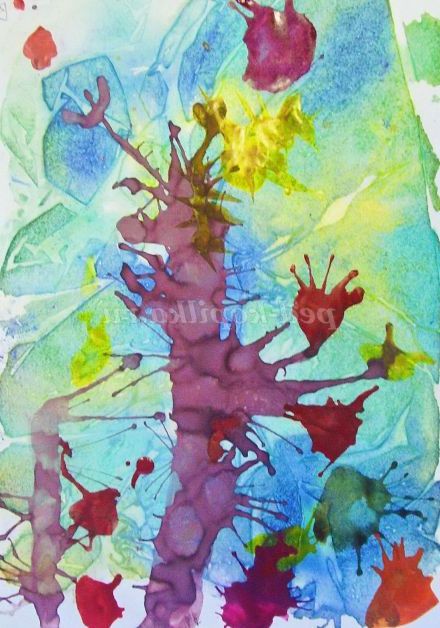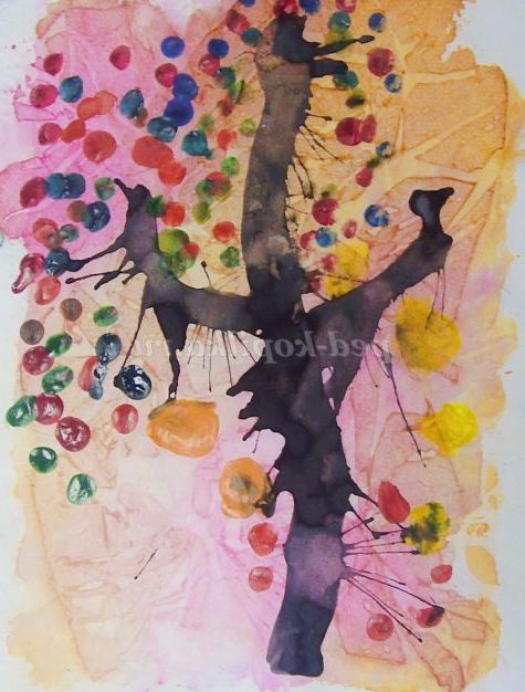 Правильно, гілки. На стовбурі дерева у мене утворилися крапельки, ці крапельки я буду роздувати за допомогою трубочки від соку в бажаному напрямку. Ось так (показую). І на очах підростають гілки дерева.
