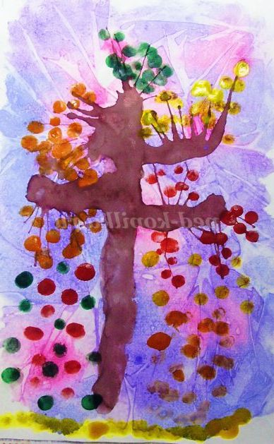 Що ще можна намалювати біля дерева? (Травичку, хмари, калюжі, відлітаючих птахів, їжачка). Траву можна також намалювати за допомогою трубочки з під соку. Ставимо невелику пляму пензликом і роздуваємо крапельку з допомогою трубочки. Ось так.