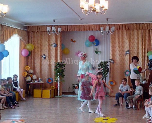 Оформлення зали: На центральній стіні зображення сонця, хмарки, птахів і квітів, на підлозі стилізовані дерева, штучні та живі квіти в горщиках і вазах.