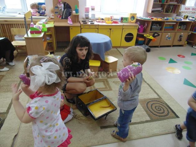 Вихователь: Ой, який гарний скриньку! Він ще й відкривається! Давайте заглянемо, що ж у ньому лежить?
