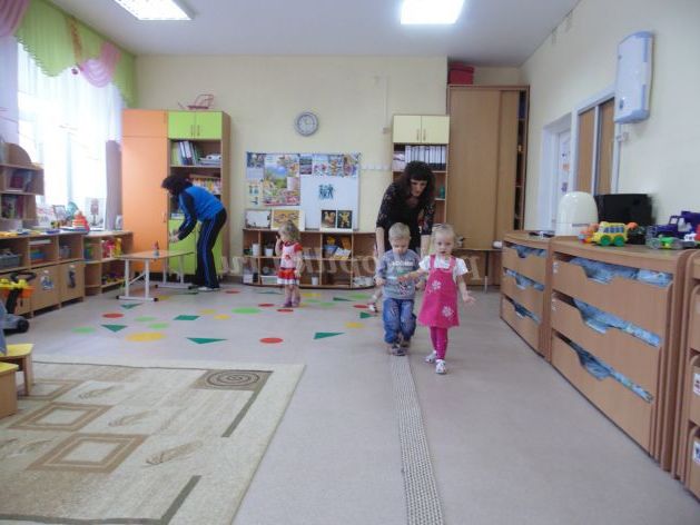 Вихователь: А наш м'ячик знову кудись покотився. Може бути він показує нам дорогу до скарбу? Давайте підемо за м'ячиком по стежці і подивимося. Тільки йти треба обережно, наступати тільки на стежку.