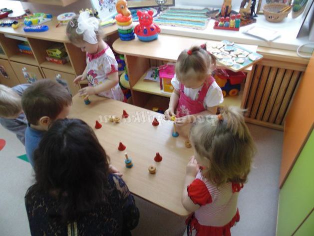 Вихователь:Ой! Подивіться хто-то все пірамідки розібрав. Ви допоможете мені їх зібрати?