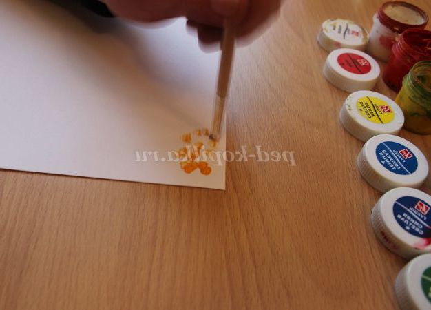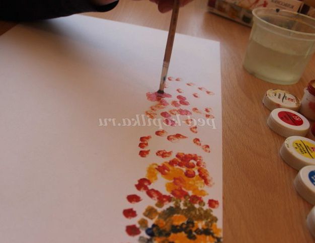 2 етап: прямо ставимо кисть, макаємо в гуаш і робимо тички на папері. Водою користуємося рідко. Починаємо з більш світлих тонів. Фото №6