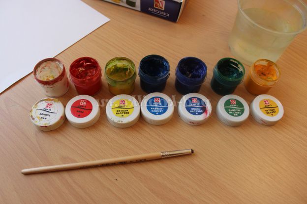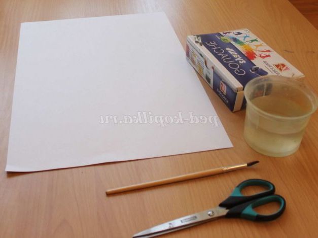 Для роботи нам знадобиться: гуаш, баночка з водою, середнього розміру, аркуш паперу, ножиці.