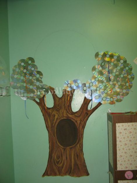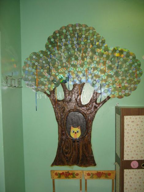 Наше дерево готове. Погодьтеся - захоплюючий процес не складних матеріалів! А скільки захоплення і радості викликає це диво - дерево у дітей! Травичку можна помацати, помилуватися казковими переливами сяючих дисків. Але головне, тепер роботи дітей казково зустрічають всіх, що входять в групу.