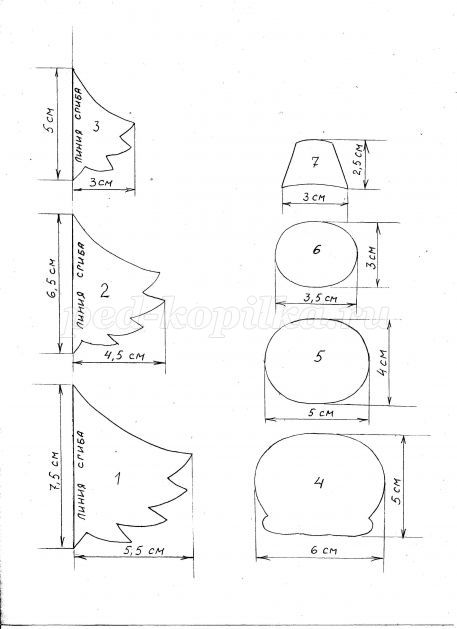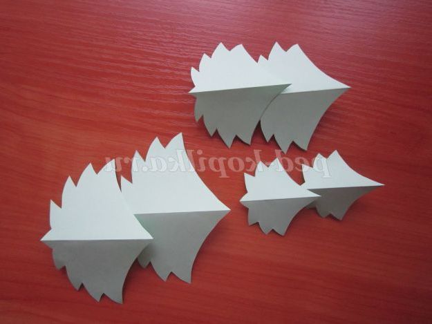 5. Гілки ялинки будемо розташовувати згинами один до одного по обидві сторони від згину картону. Почнемо з нижніх гілок (деталь №1). Клей наносимо тільки на бік, прилеглу до картону до згину. Наклеїв гілочки так, щоб другі їх половинки вільно піднімалися і опускалися.