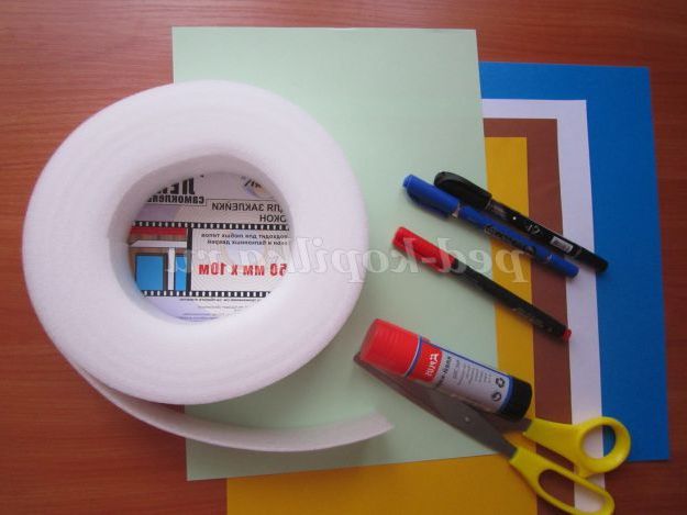 15. З ущільнювача зробимо сніг. Виріжемо по хвилястій лінії смужку шириною приблизно 1,5 см, довжиною рівній нижньому краю картону. Наклеїли. Наша виріб готова. Бажаю всім новорічного настрою!