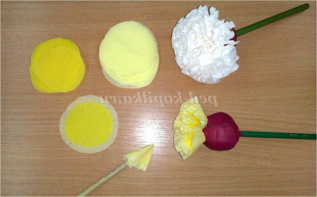 І таким же способом, як і в першому варіанті квітів, "торцюємо" на пластиліні "пелюстки" з приготованих заготовок круглої і квадратної форми. Пелюстки рівномірно маємо на пластиліні на 1/2 частини кульки, а потім робимо торцювання з серветок зеленого кольору.
