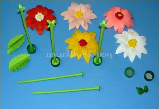 З картону вирізати трафарети кольорів (п'яти або шести пелюсткові) трьох розмірів. Обвести трафарети на папері, вирізати заготовки кольорів
