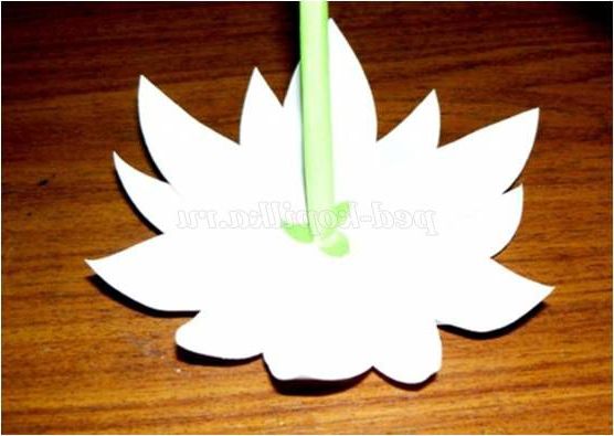 Збираємо квітка. Три деталі квітки з'єднати між собою промазав клеєм тільки середину. Потім пелюстки загнути донизу за допомогою ножиць або олівця.