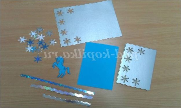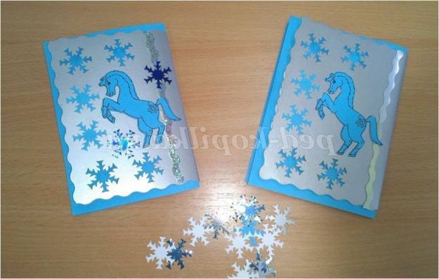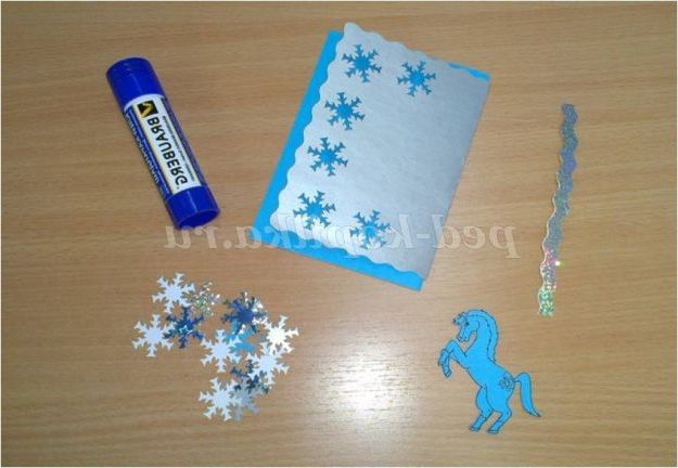 Оформляємо лицьову сторону листівки: приклеюємо сріблясту смужку, конячку, сніжинки.