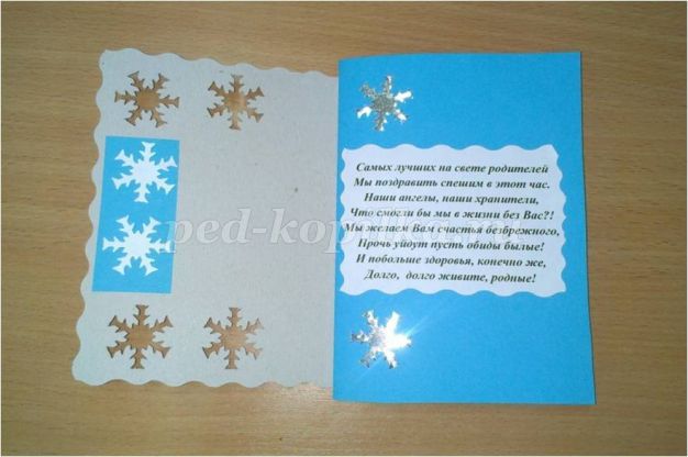 На розвороті листівки можна помістити вітальний вірш і сніжинки для прикраси.