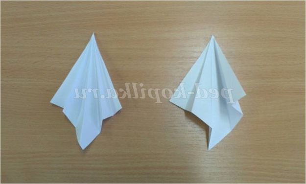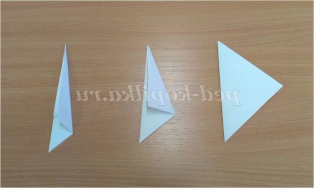Для виготовлення ялинки квадратний аркуш паперу складаємо навпіл по діагоналі, потім ще раз навпіл і ще раз.