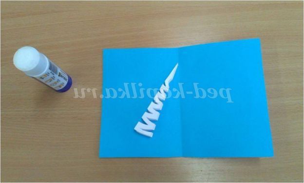 На внутрішній стороні листівки, в центрі (лінії згину) - розміщуємо ялинку. Для цього спочатку одну сторону заготовки змащуємо клеєм і приклеюємо її навскоси до паперу. Потім змащуємо клеєм іншу сторону ялинки і акуратно закриваємо листівку, злегка притискаючи.