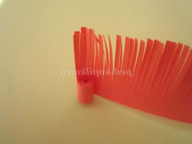 4. Для серединки квітки: з половинки смуги оранжевого кольору скрутіть щільну спіраль. Широку помаранчеву смугу наріжте бахрому і щільно накрутіть на спіраль.