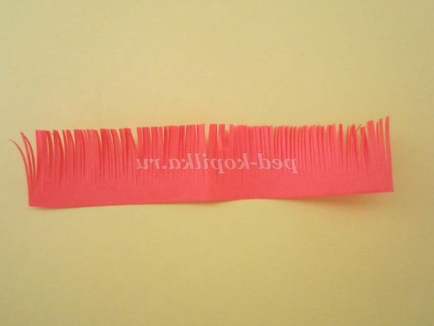 Інструменти і матеріали: ножиці, клей ПВА, смужки паперу для квілінгу шириною 7 мм (червоні, оранжеві, зелені), помаранчеві смужки шириною 1,5-2 см, лист картону жовтого кольору.