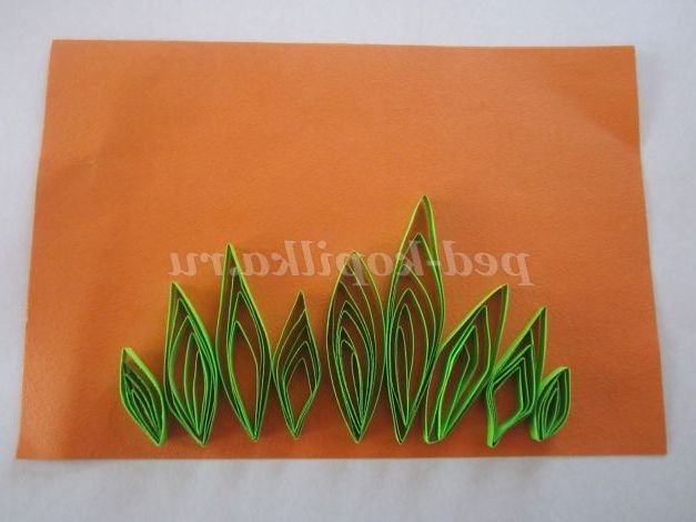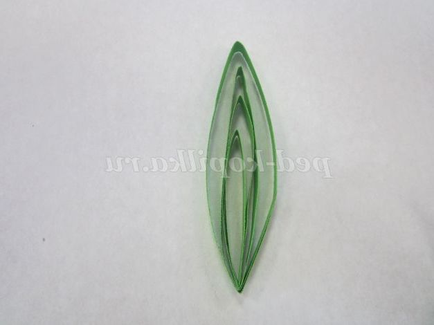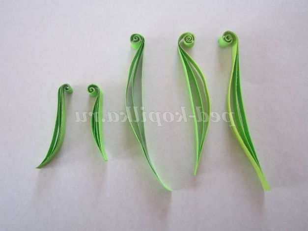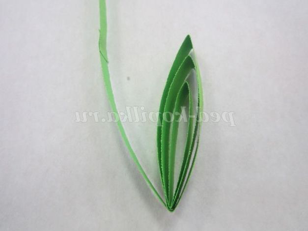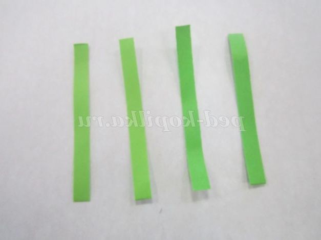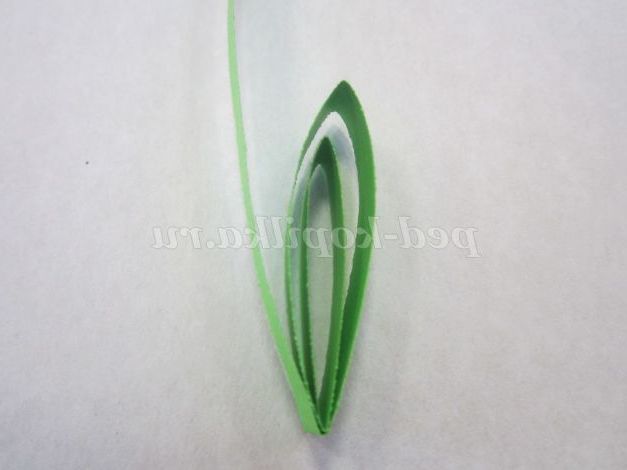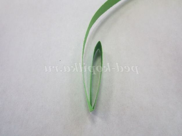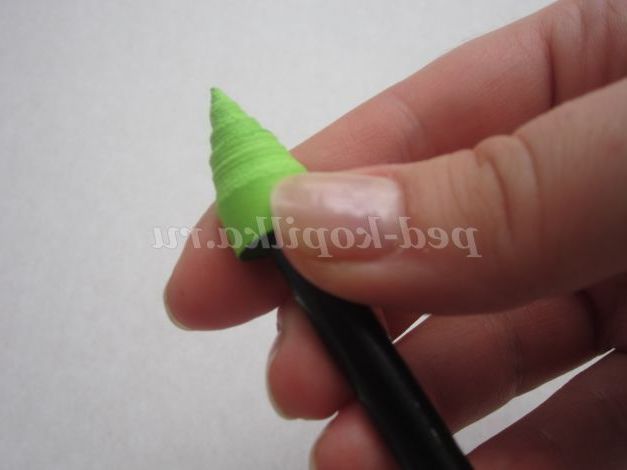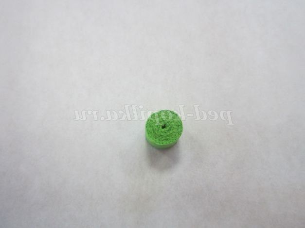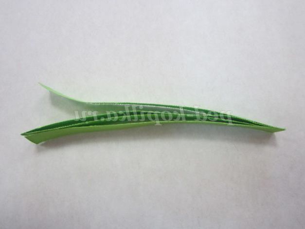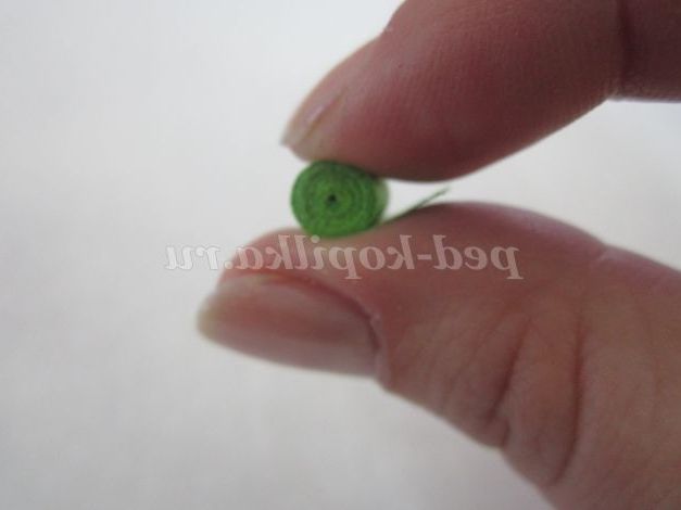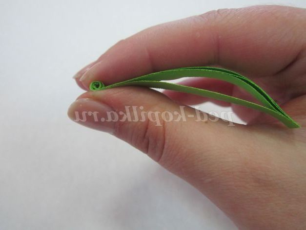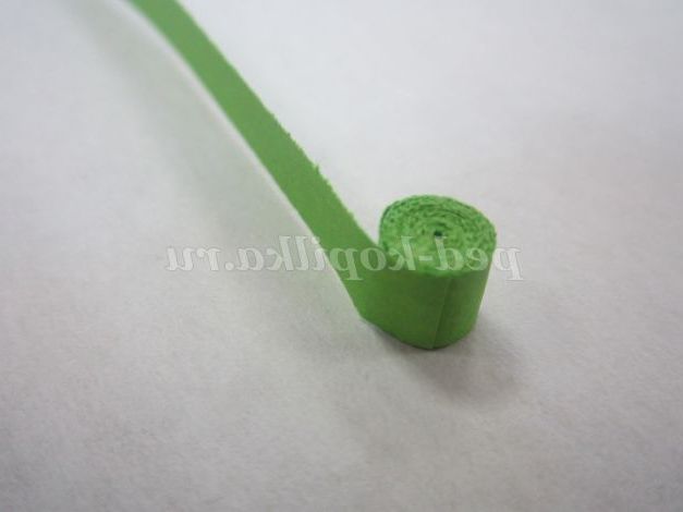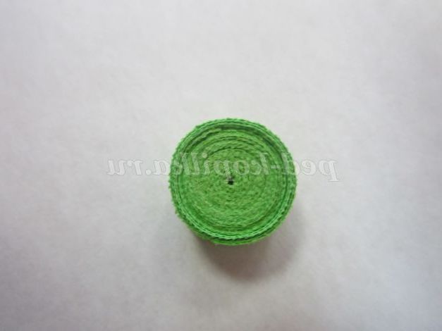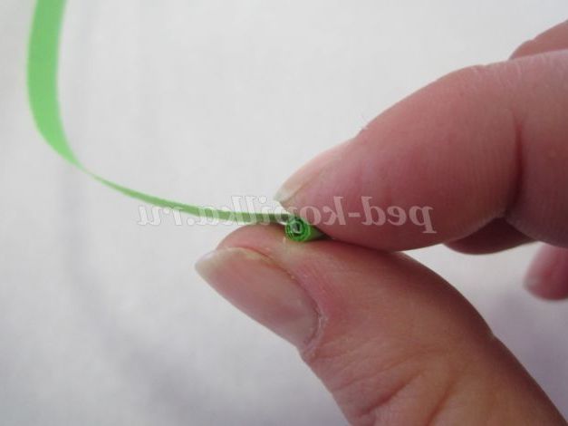 1.Возьмите смужку зеленого кольору, потріть кінець смужки нігтем для легкого скручування. Загорніть кінець смужки, не залишаючи отвори в середині, і щільно скручують. Кінець смужки підклейте.