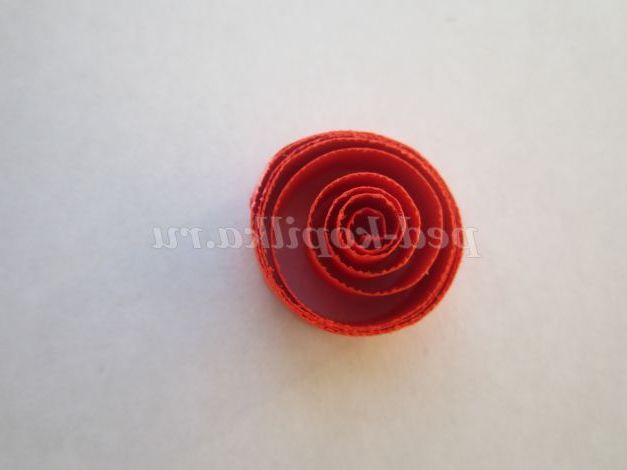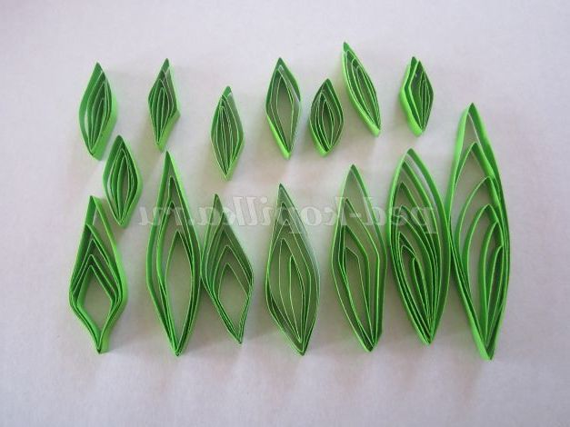 15. Для листя: на кінці зеленої смужки зробіть петельку і з кожним обертом петельки збільшуйте. Кінець смужки приклейте.