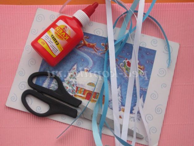 Інструменти і матеріали: ножиці, клей, смужки паперу для квілінгу (білі, сині, блакитні), листівка або малюнок із зимовим пейзажем, лист картону.