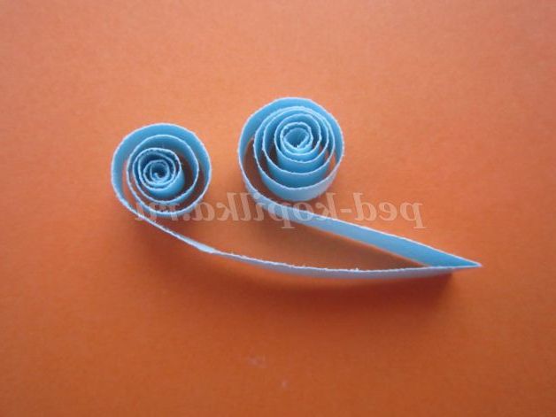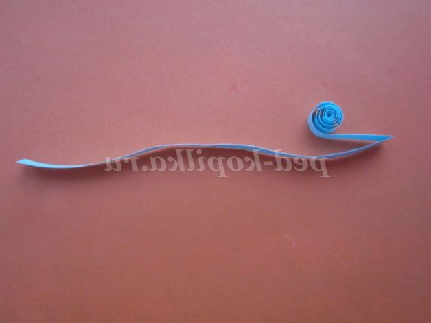 2. Візьміть сині смужки. Скрутіть спіраль і розгорніть її. Кінець смужки підклейте. Вийшла вільна спіраль.