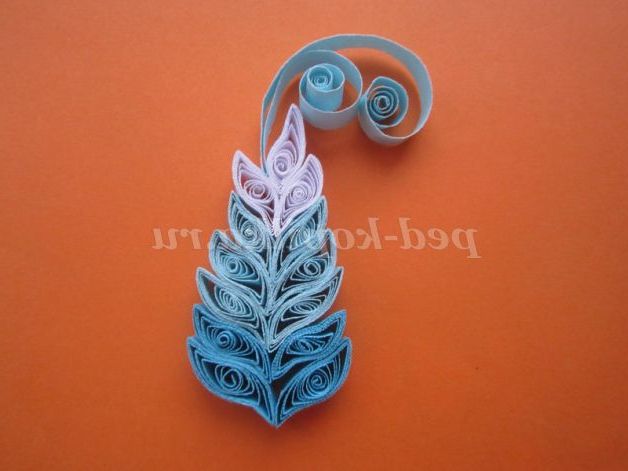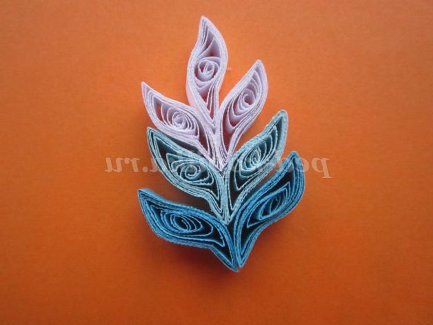 12. Смужку блакитного кольору складіть навпіл і закрутіть кінці по черзі в одну сторону. Приклейте до верхівки гілочки.