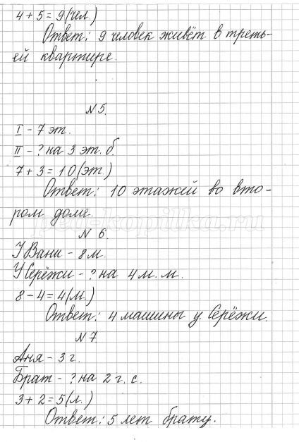 4. В одній квартирі живе 4 людини, а в інших 5 осіб, а в третій настільки - ко, скільки в першій і другий разом. Скільки людина живе в третій квартирі?