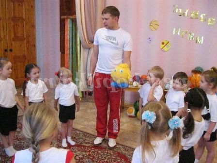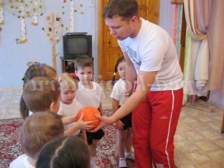 З навчаючим: знайомство з історією виникнення м'яча за коштами відео презентації «Подорож м'яча» (старші групи); усний журнал «Які м'ячі є в спортивному залі і як їх використовувати?» (середня група); робота з розмальовками «М'яч у грі» (всі вікові групи)