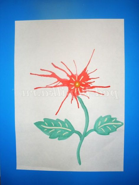 2. Взяти кисть,занурити її у воду,не струшуючи капельку.поднести кисть над аркушем паперу,дочекатися,поки фарба капне. Щоб крапелька вийшла більш об'ємною,можна натиснути на кисть двома пальцями