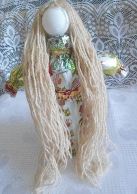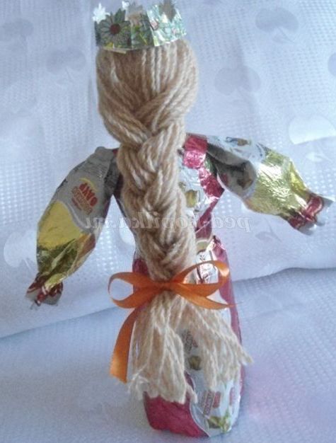 10. Рівняємо волосся, заплітаємо косу, зав'язуємо бант, вирізаємо з фантика смужку ромашок, робимо вінок, одягаємо на голову, лялька готова. Назвемо її Оленка.