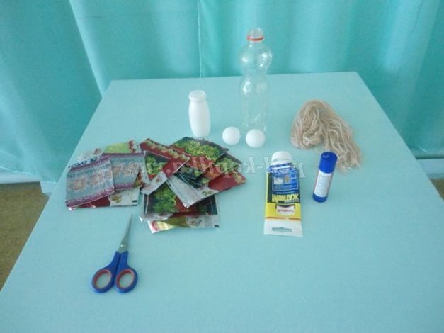 1. Для виготовлення ляльок потрібні наступні матеріали: пластикові пляшки для тулуба (я використовую з - під «Фанти»), тенісний кульку для голови, нитки для волосся, стрічки, банти, оченята, фантики різного кольору і розміру, випрасувані теплою праскою, клей «Момент» (рідкі цвяхи), клейовий олівець, ножиці.