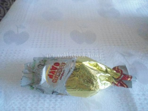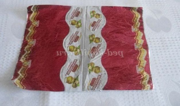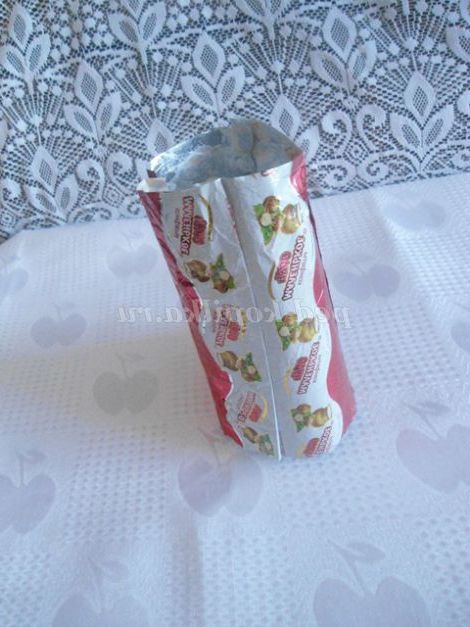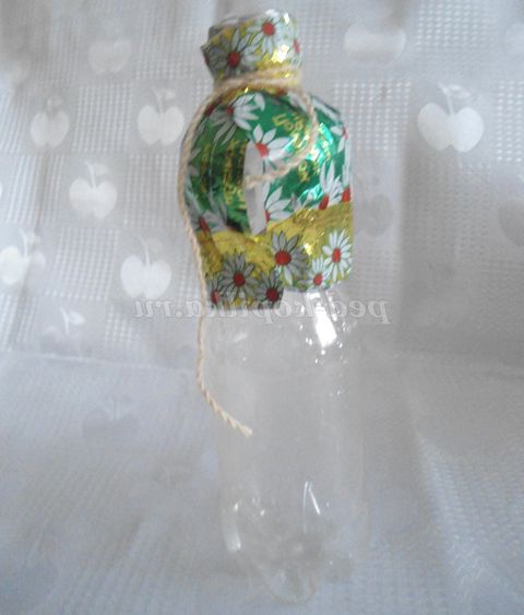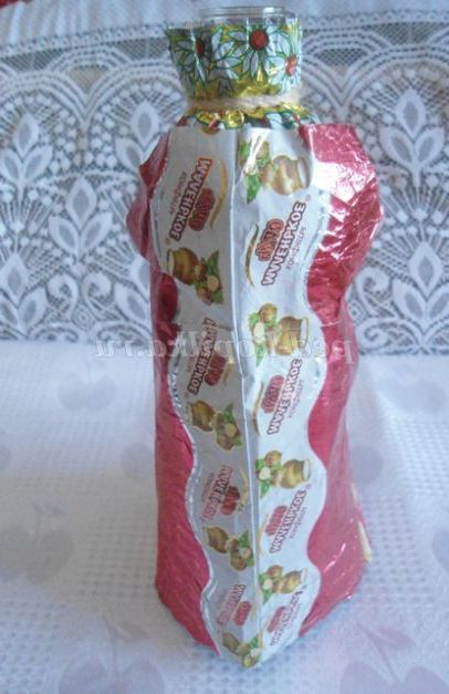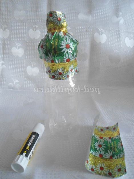 2. Починала роботу з наклеювання фантиків на пластикової пляшки зверху, з блузки: спочатку зібрала краю 2-х фантиків у пляшки, попередньо намазавши клеєм. Щоб краще прилягало, можна прив'язати ниткою, кінці роботи нитку прибрати.