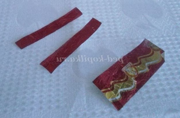 5. Вирізаємо з фантика смужки для лямок сарафана і приклеюємо їх.