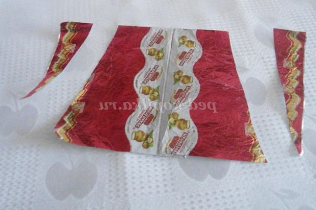 4. Для рукавів склеїла фантики в циліндр, збираємо низ рукава і верх і приклеюємо до плечей.
