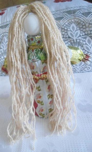7. Волосся роблю з ниток : намотую велику пасму для коси (вона має бути довший тулуба, тому що при плетінні вона зменшується) і маленьку для чілки, посередині перев'язую.
