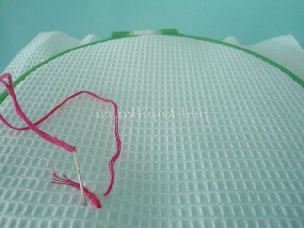 11.Затем голку вводимо в цей же кут поруч з хвостиком і виводимо знову в цей же лівий нижній кут цієї клітини, нитка ляже зверху і нитка закріпиться. Хвостик відрізаємо ножицями. (фото 11)