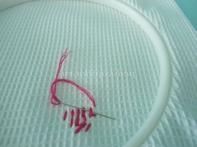 13.Когда нитка закінчується її необхідно закріпити: на виворітній стороні поруч з другою ниткою знаходимо стібок і в нього протягуємо голку з ниткою, і в петлю протягуємо знову голку з другою ниткою. Вийти вузлик. Можна для міцності повторити ще раз. І відрізаємо нитку. (фото13, 13а, 13б)