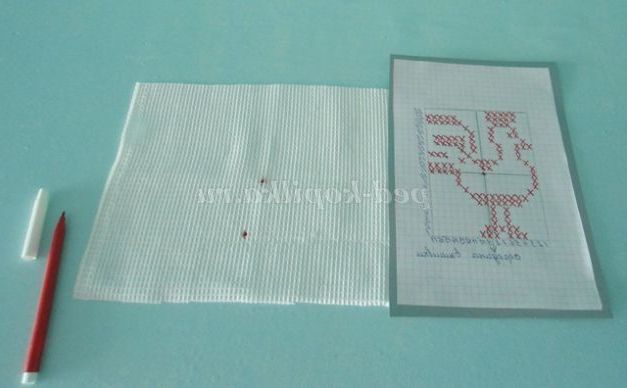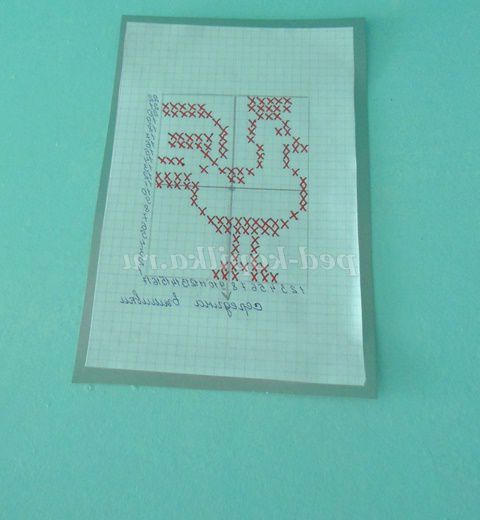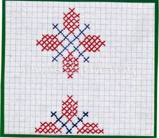 6.Начинаем вышиванье знизу вгору з визначення місця для першого хрестика. Вишивка хрестиком відноситься до лічильної вишивки, тобто потрібно вважати клітини. Розглядаємо схему, знаходимо найдовший горизонтальний ряд хрестиків, на ньому знаходимо середину, вважаючи клітини. Проводимо простим олівцем пряму лінію за допомогою лінійки і укладаємо візерунок в квадрат або прямокутник, при вишиванні буде зручно вважати клітини. (Фото 6)