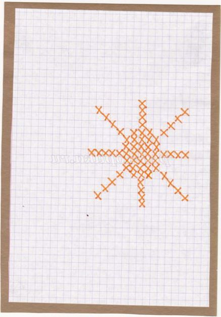 7.Теперь потрібно знайти місце для першого хрестика на тканини, Знаходимо середину на тканини: складаємо тканину навпіл (можна порахувати клітини). На схемі знаходимо нижній горизонтальний ряд, відраховуємо вправо необхідну кількість клітин від середини візерунка. Це місце першої клітини! (Зверніть увагу на вишивання сонечка: вишивати починаємо з самого сонечка, потім промінчики, не забудьте знизу залишити для них місце). Так само потрібно не забути залишити по краях тканини місце для рамки, для тасьми.