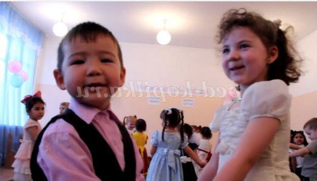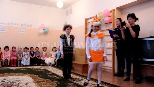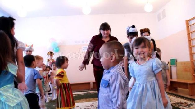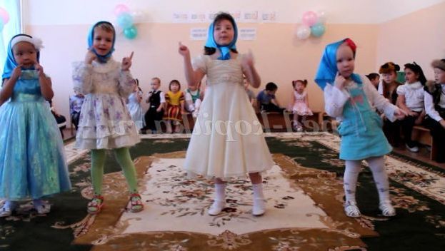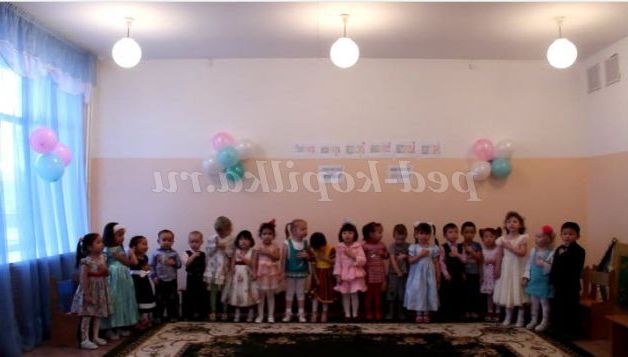 Під музику до зали входять діти 2 молодшої групи з блакитними і жовтими прапорцями в руках і виконують музично-ритмічну композицію «Казахстан».
