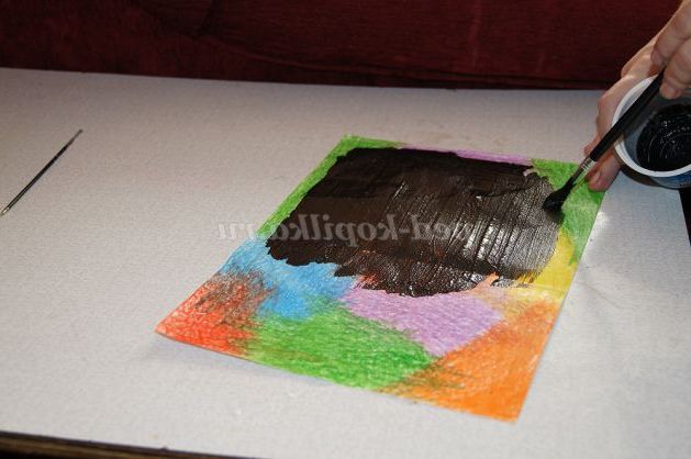 Покриваємо малюнок чорною гуашшю. P.S гуаш краще перемішати з рідким милом для більш рівномірного нанесення фарби. Отриманою сумішшю покрити аркуш за допомогою пензля.