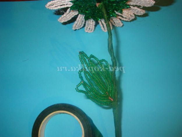 Потім візьміть зелену флор стрічку і обмотайте стебло. Не забудьте примотати листочок