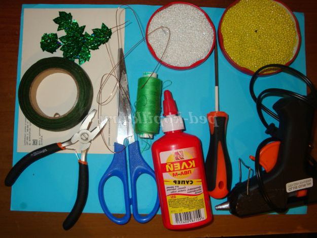 Для виготовлення таких ромашок, Вам знадобиться: бісер (жовтий, білий, зелений), дріт 0,3 розміру), дріт товстіший, картон, шило, зелені нитки, клей «Пістолет»,клей ПВА, ножиці, плоскогубці, паєтки, флор стрічка.