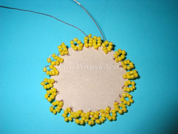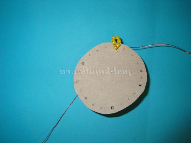 Візьміть шматок дроту, довжиною 50 см і наберіть на нього 7 бісерін жовтого кольору, після чого скрутіть два кінця дроту.