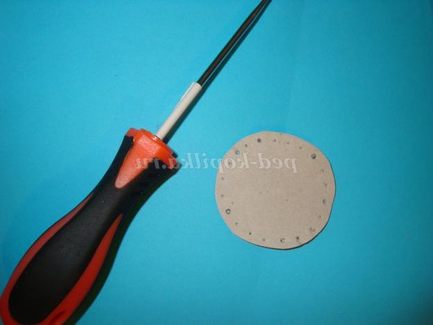 На картоні накресліть коло, діаметром 5 див. Виріжте його. Відступите від краю кола 5мм і шилом проробіть отвори на відстані 3-4 мм