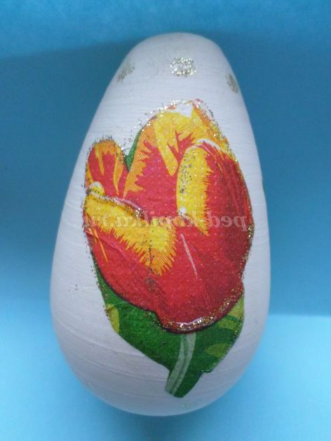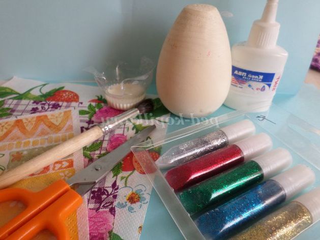 Для виготовлення сувенірного яйця необхідні такі матеріали та інструменти:барвиста серветка, клей ПВА,гель з блискітками, ножиці і, звичайно, саме яйце, можна дерев'яне, біла акрилова фарба.