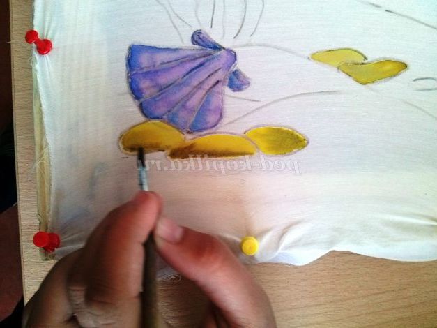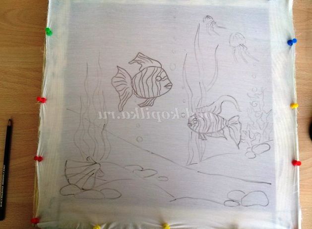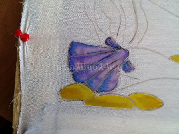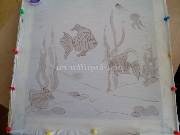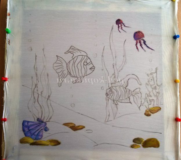 в першу чергу треба добре випрати тканину, так як тканини обробляють спеціальним складом на який фарби добре лягають, не просочують тканина, часто погано розтікаються. Поки тканина сира закріплюємо її на підрамник кнопками, гарненько натягуємо, по звуку добре натягнута тканина повинна звучати як барабан. Після висихання наносимо малюнок м'яким олівцем.